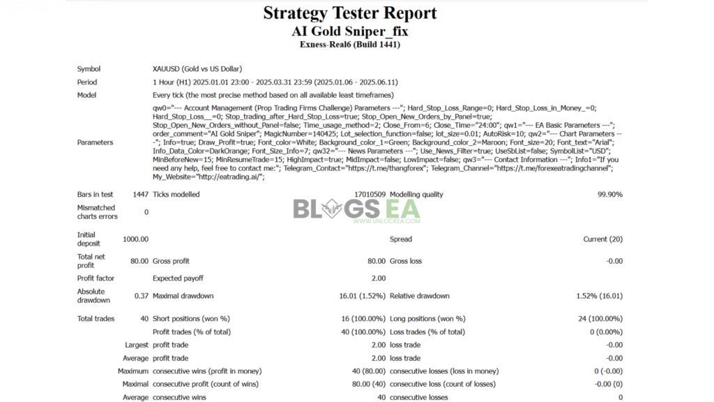 The AI Gold Sniper EA proved to be a high-precision, low-risk automated gold trading system, delivering the same results on both $200 and $1,000 accounts. With a 100% win rate across 40 trades, strict stop-loss & take-profit structure, and a news-filter for safety, it generated $80 profit with exceptionally low drawdown.