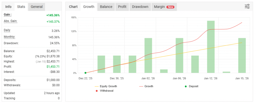 The verified trading statement associated with Bitcoin Robot Grid MT4 reflects a strong period of growth achieved through systematic grid execution on BTCUSD. Starting from an initial deposit of $1,000, the account reached a balance of approximately $2,453, generating a net profit of around $1,453 within less than one month of trading. During this period, the EA executed 68 completed trades, all of which were closed in profit, resulting in a 100% trade closure rate. More importantly than individual trades, the history shows consistent basket-based trade cycles, where multiple layered positions were opened during price movements and later closed collectively once the predefined profit threshold was achieved. This confirms that the system’s performance was driven by structured grid recovery rather than random single-entry wins. The results demonstrate the EA’s ability to effectively capitalize on Bitcoin’s volatility by transforming market retracements into controlled profit opportunities. Nevertheless, from a professional standpoint, it must be emphasized that grid-based systems inherently experience periods of floating drawdown. Therefore, sustaining such performance over the long term depends critically on conservative lot sizing, sufficient account equity, disciplined risk controls, and stable VPS execution.