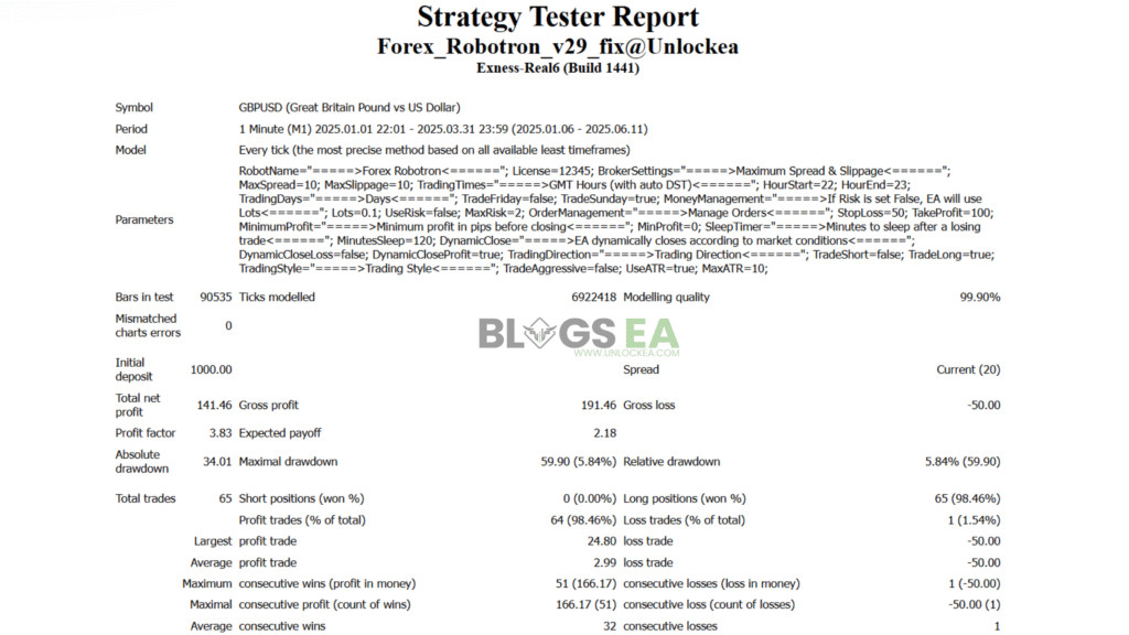 Across the entire backtest period, the EA opened 65 trades, generating a net profit of $141.46 from the initial $1,000 balance forex robertron 1000. The average profit per trade was around $2.18, demonstrating the strategy’s scalping nature.