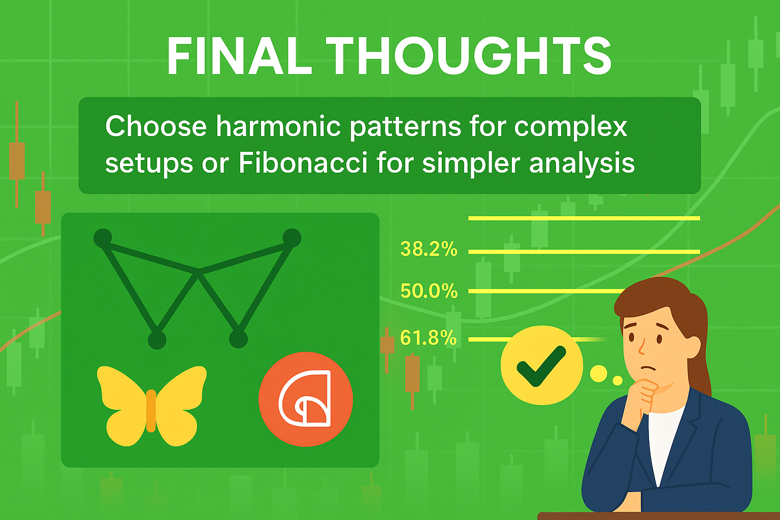 The choice between the structured geometry of harmonic patterns and the fluid versatility of basic Fibonacci trading boils down to your preference for complexity versus simplicity. Harmonic patterns offer high-precision, high-reward opportunities but demand patience and deep knowledge. Basic Fibonacci trading provides an easily applicable tool that can enhance almost any existing strategy.