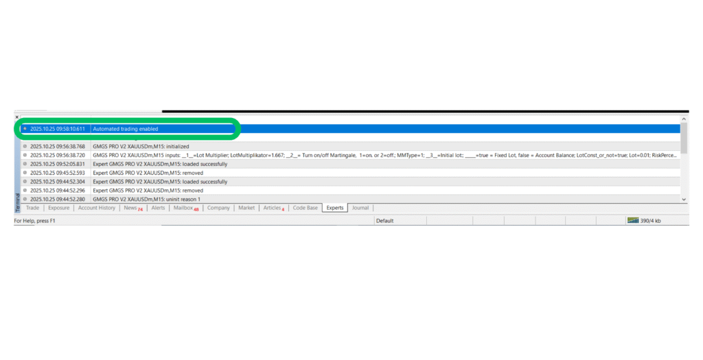 When your Expert Advisors is correctly installed and trading permissions are enabled, you’ll see a confirmation message like Below that, you might also see entries showing