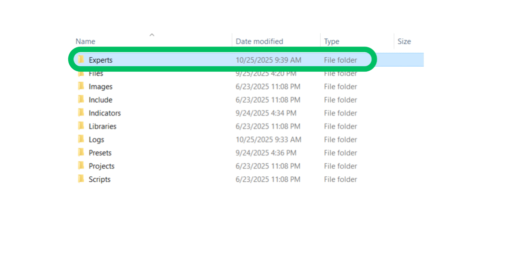 Among them, locate the folder named “Experts”. This is where all your Expert Advisors (EAs) or trading robots must be placed.