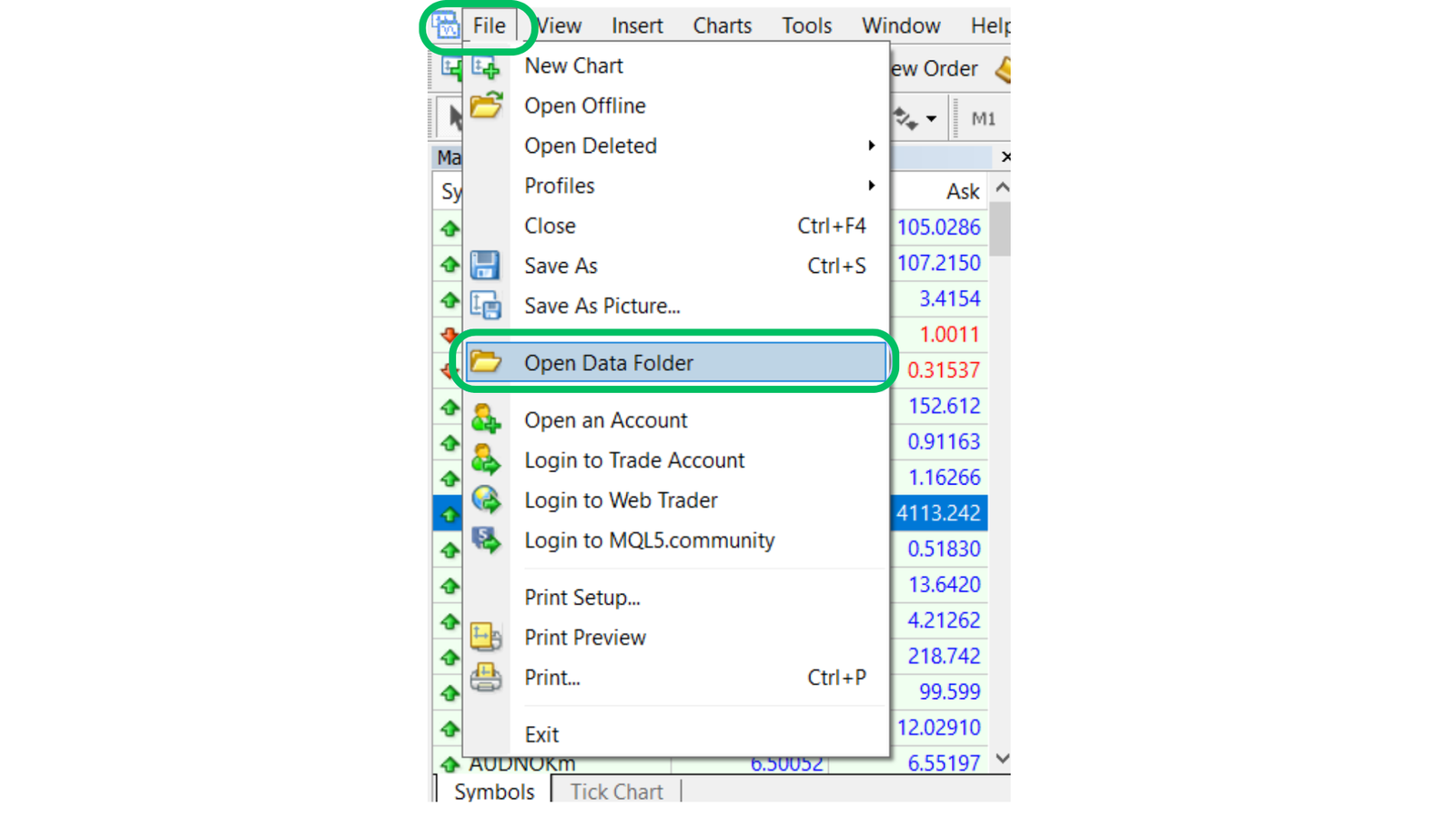 At the top-left corner of your MetaTrader platform, click