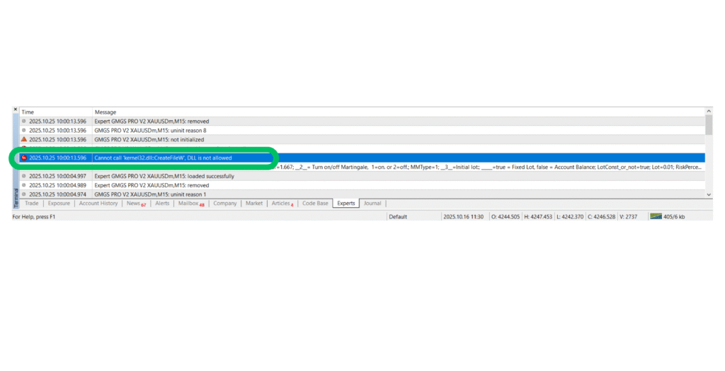 If you see these messages without any errors or warnings, congratulations — your Expert Advisors is live, functioning, and ready to trade automaticallyThis means your Expert Advisor (EA) tried to use a DLL (Dynamic Link Library) file function, but MetaTrader blocked it because DLL imports aren’t currently enabled.