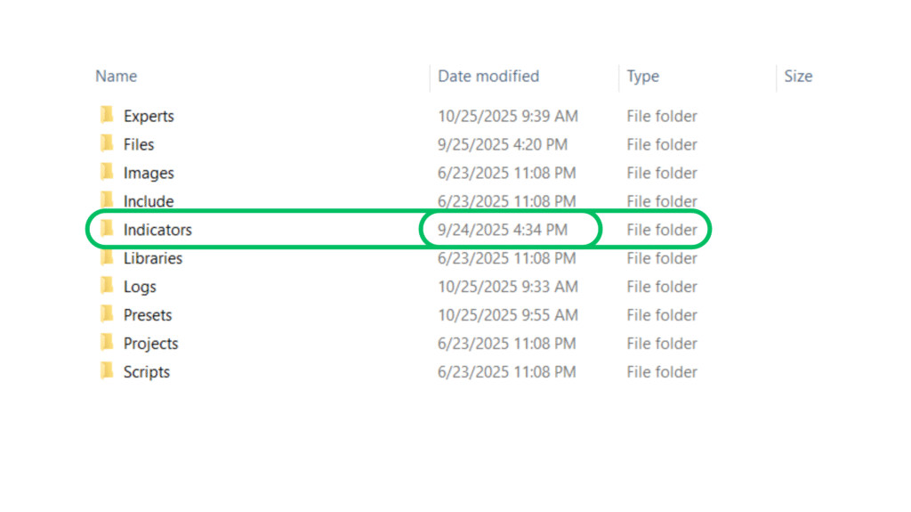 In MT4, you’ll find an “Indicators” folder (shown below). This is where all your built-in and custom indicators are stored. Indicators — Created by developers to add unique trading tools (files ending in .ex4