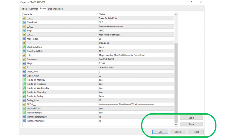 • The Save button allows you to store your Expert Advisors settings as a preset file (with the extension .set). This is useful when you’ve fine-tuned all your input parameters (like lot size, take profit, trading hours, etc.) and want to reuse them later. Once saved, you can apply the same configuration on another chart or even after restarting MT4.
