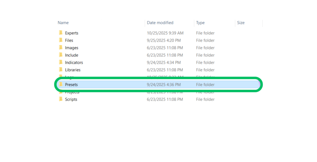 If you don’t see an indicator (.ex4 / .mq4) or set file (.set) in your EA’s folder, simply skip their installation and move straight to Step 6.Many EAs work perfectly using their own built-in logic without relying on external files. After placing your EA in the Experts folder, you might also see another folder named “Presets”