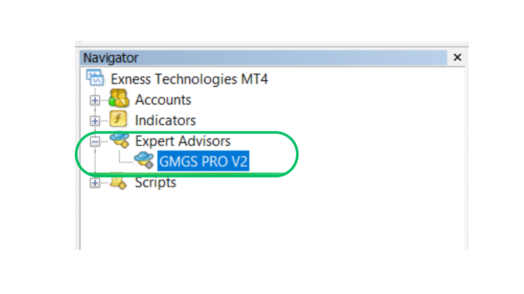 In this example, the file “GMGS PRO V2.ex4” is the Expert Advisor. Simply copy and paste your EA file into this folder.