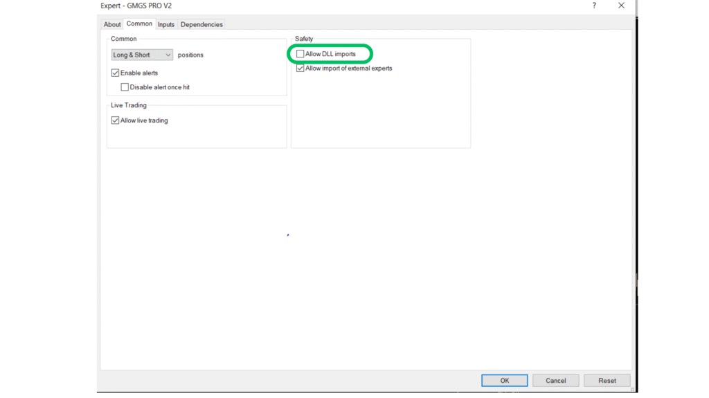 • To make the EA run properly, you must manually allow DLL imports in the settings.