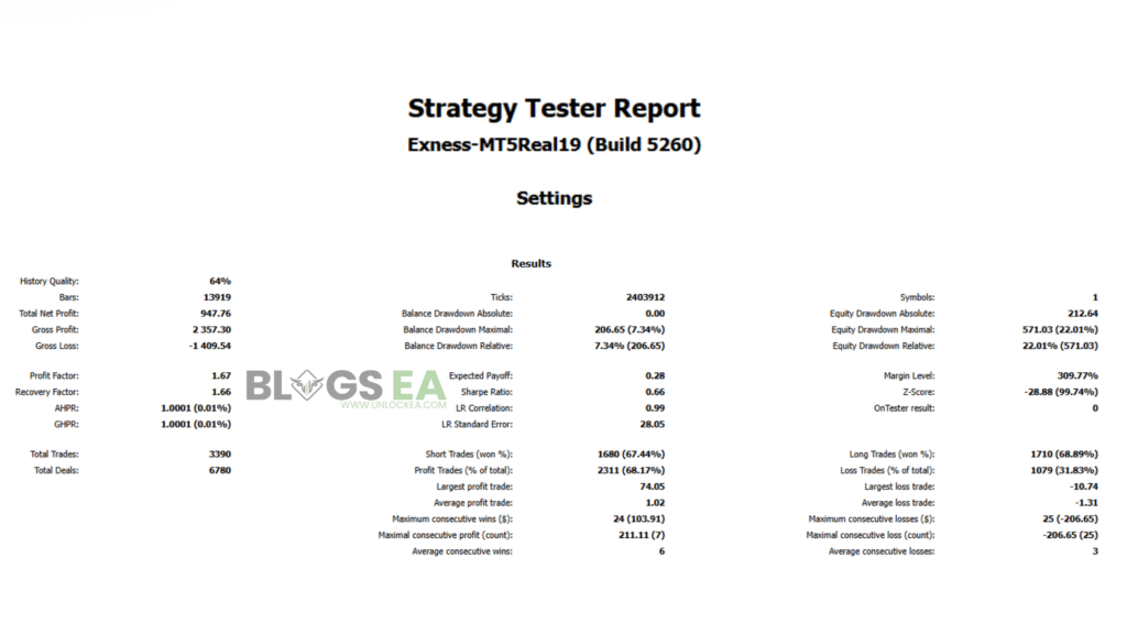 Over the full test duration, the EA turned the initial $1,000 balance into $1,947.76, generating a net profit of $947.76. This nearly 94.7% return over the testing period highlights slow-and-steady equity growth. The EA produced a profit factor of 1.67, meaning it earned $1.67 for every $1 lost — a healthy sign of profitability in algo trading. The system generated 2,357.30 in gross profit, against 1,409.54 in gross losses, confirming consistent winning cycles over time.